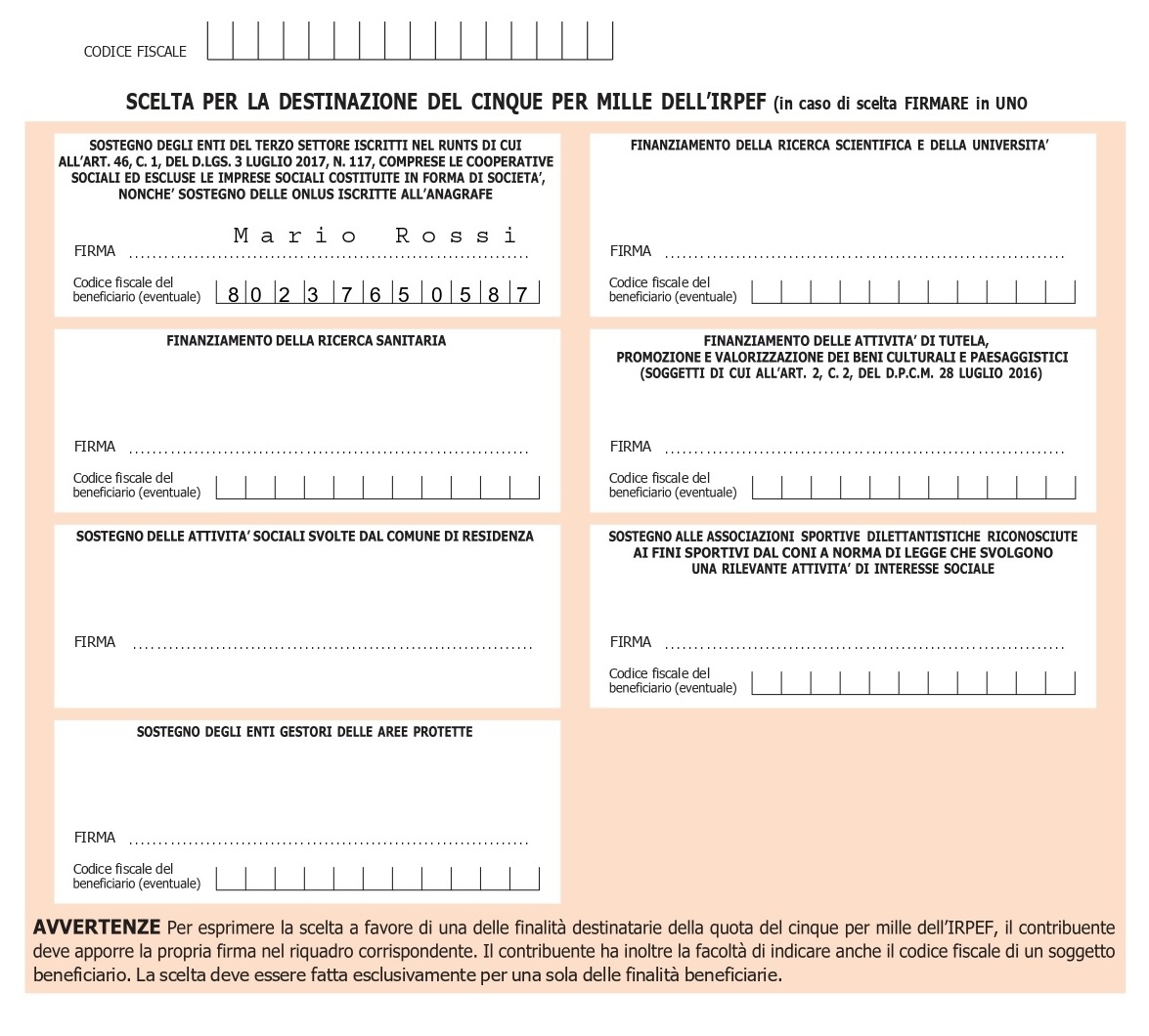 nel riquadro “Scelta per la destinazione del cinque per mille dell’IRPEF” nella sezione “SOSTEGNO DEGLI ENTI DEL TERZO SETTORE ISCRITTI NEL RUNTS DI CUI ALL’ART. 46, C. 1, DEL D.LGS. 3 LUGLIO 2017, N. 117, COMPRESE LE COOPERATIVE SOCIALI ED ESCLUSE LE IMPRESE SOCIALI COSTITUITE IN FORMA DI SOCIETA’, NONCHE’ SOSTEGNO DELLE ONLUS ISCRITTE ALL’ANAGRAFE”;